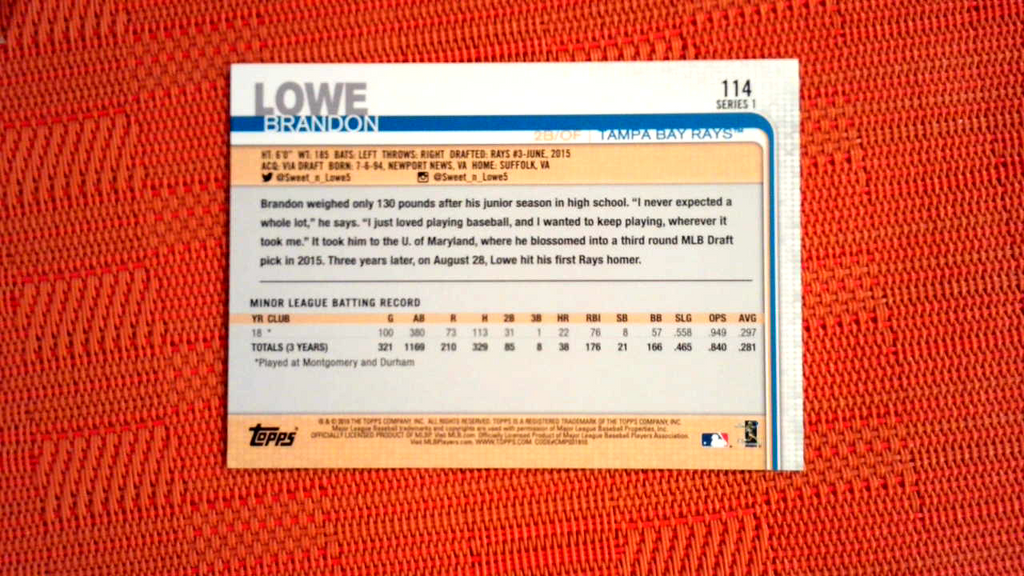 2019 Topps BRANDON LOWE #114 Rookie RC Gold 150th Stamp Parallel Baseball Cards