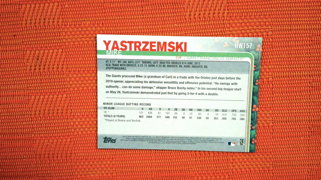 This is a nice example of a 2019 Topps Holiday #HW157 Mike Yastrzemski .