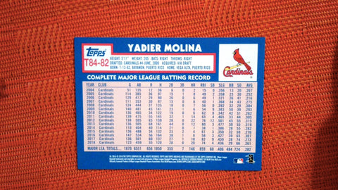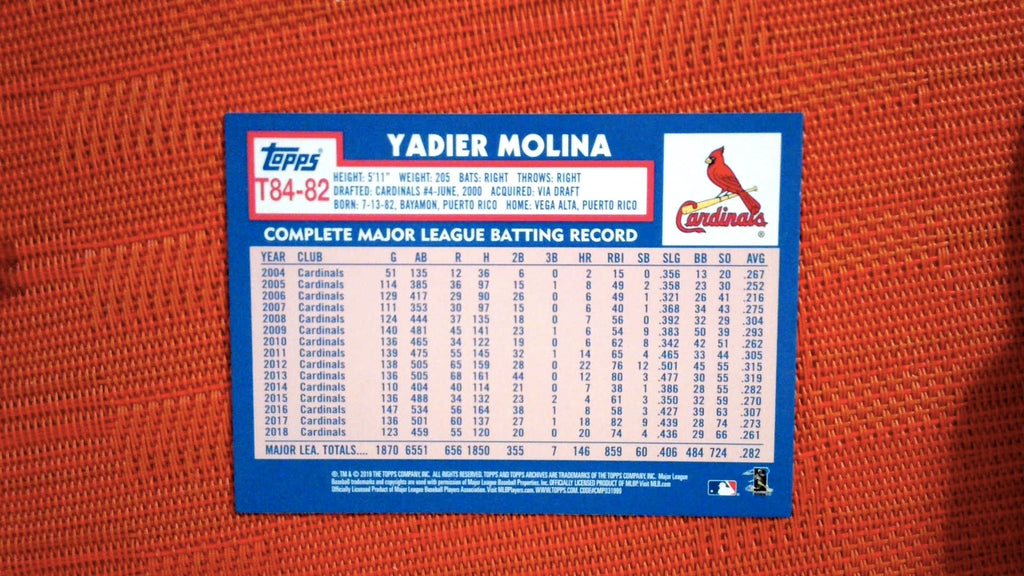 This is a nice example of a 2019 Topps #T84-82 Yadier Molina 1984 Baseball.
