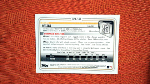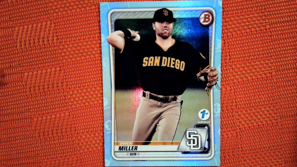 This is a nice example of a 2020 Bowman 1st Edition #BFE-102 Owen Miller Sky Blue.