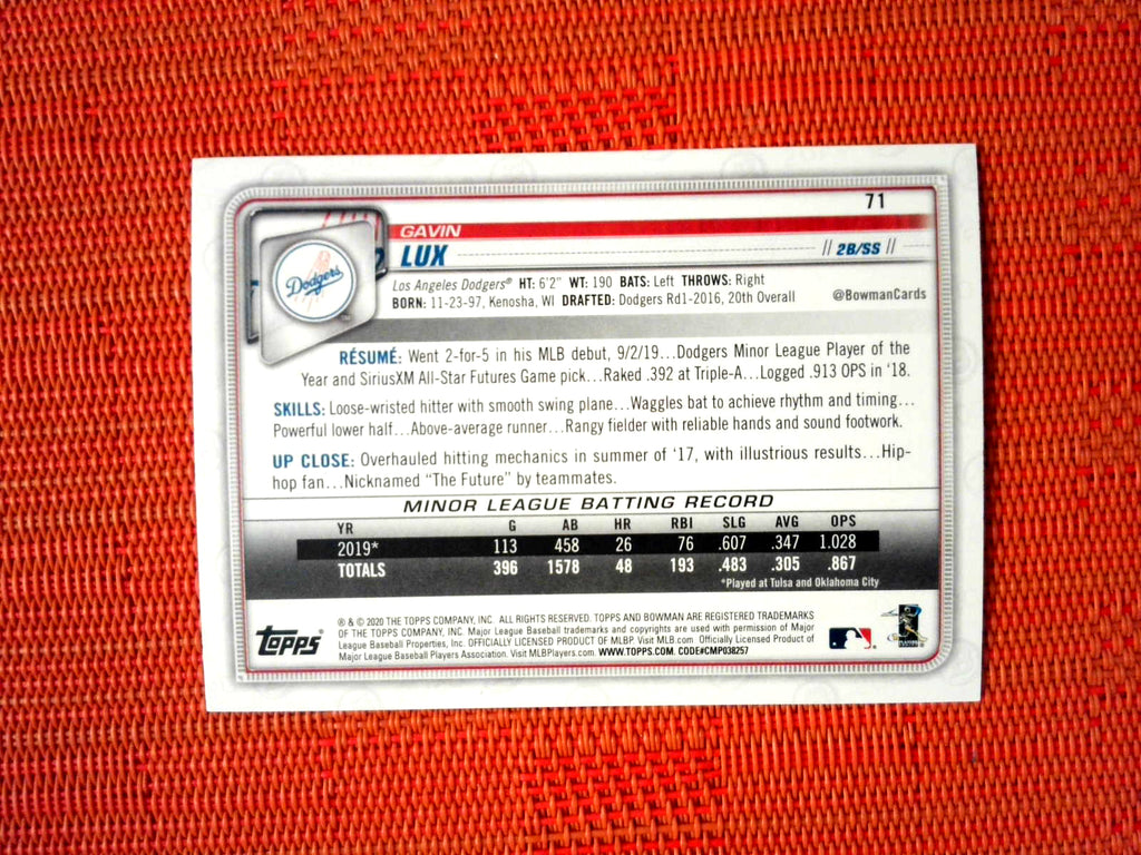 2020 Bowman #71 Gavin Lux - Los Angeles Dodgers RC (Base)