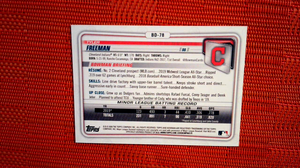 2020 Bowman #BP40 Tyler Freeman - Cleveland Indians Purple /250 Numbered