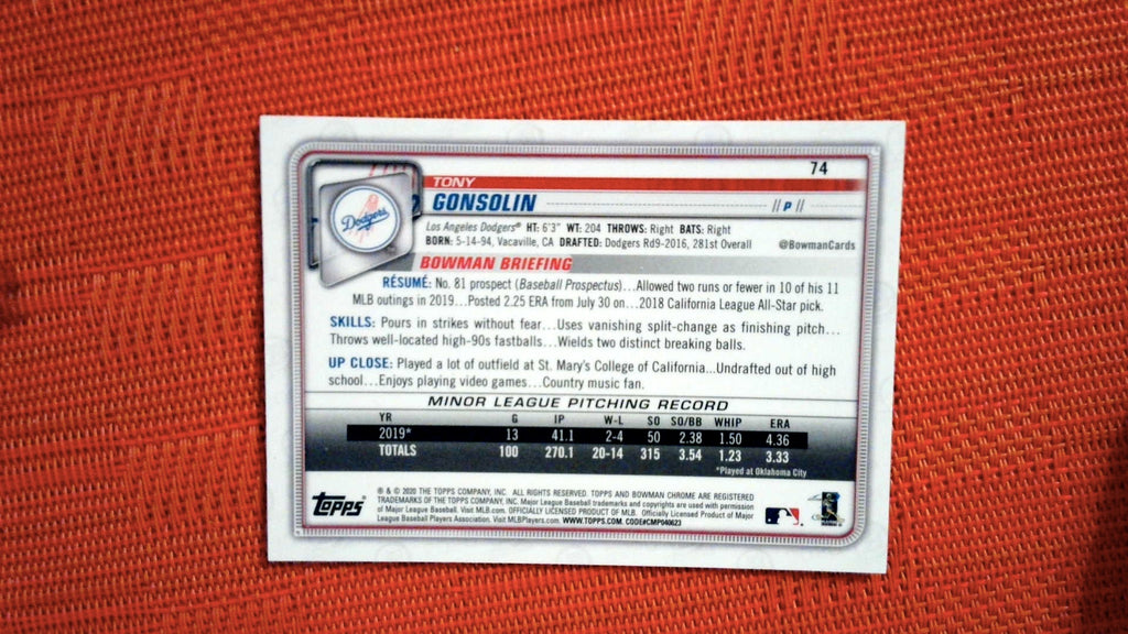 This is a nice example of a 2020 Bowman Chrome #74 Tony Gonsolin .