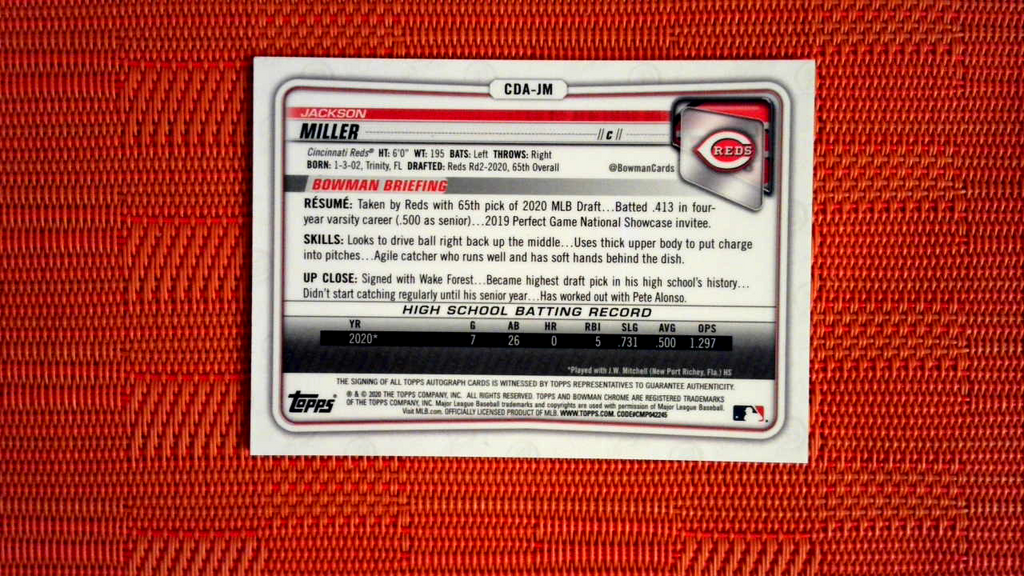 2020 Bowman Chrome Draft JACKSON MILLER Black Refractor Auto RC /75 REDS