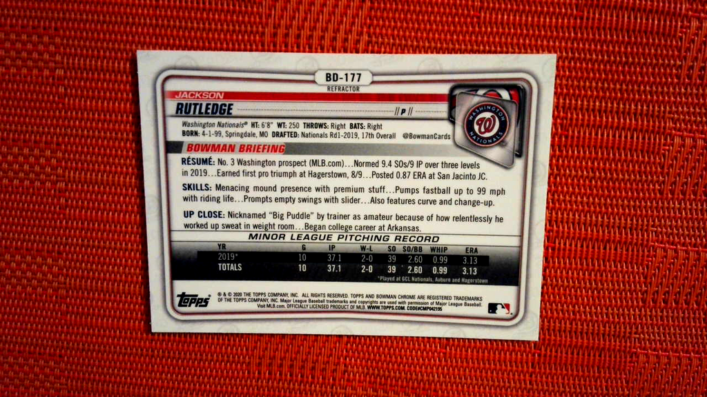 2020 Bowman Chrome Draft Jackson Rutledge Refractor Prospect BD-177 Nationals