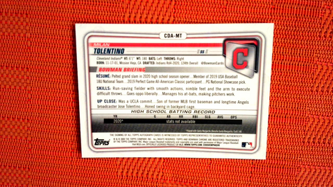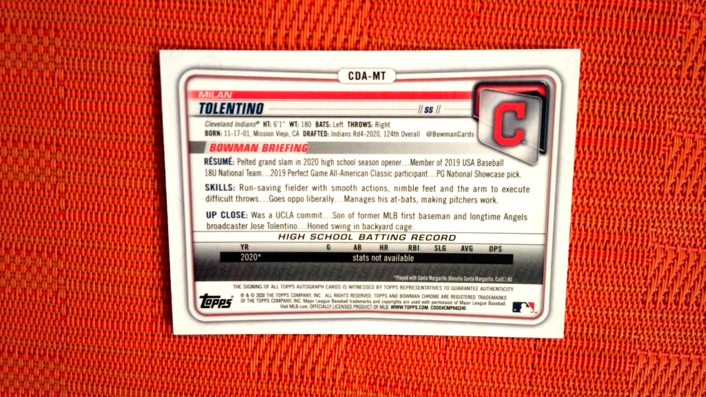 2020 Bowman Chrome Draft Milan Tolentino Indians Orange Refractor Auto #20/25