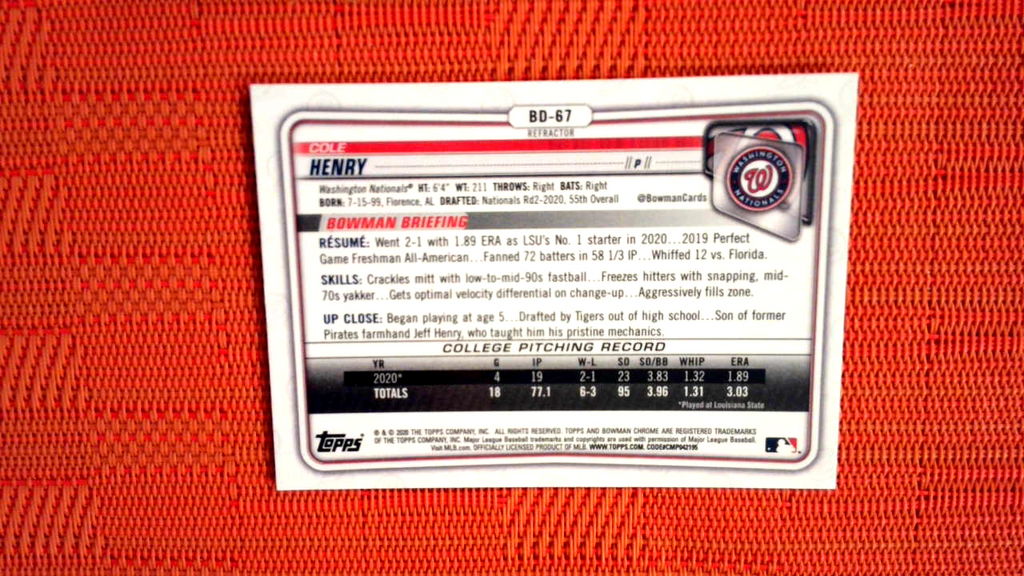 2020 Bowman Chrome Refractor COLE HENRY Rookie RC Washington NATIONALS #BD-67