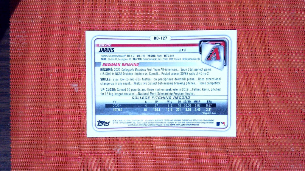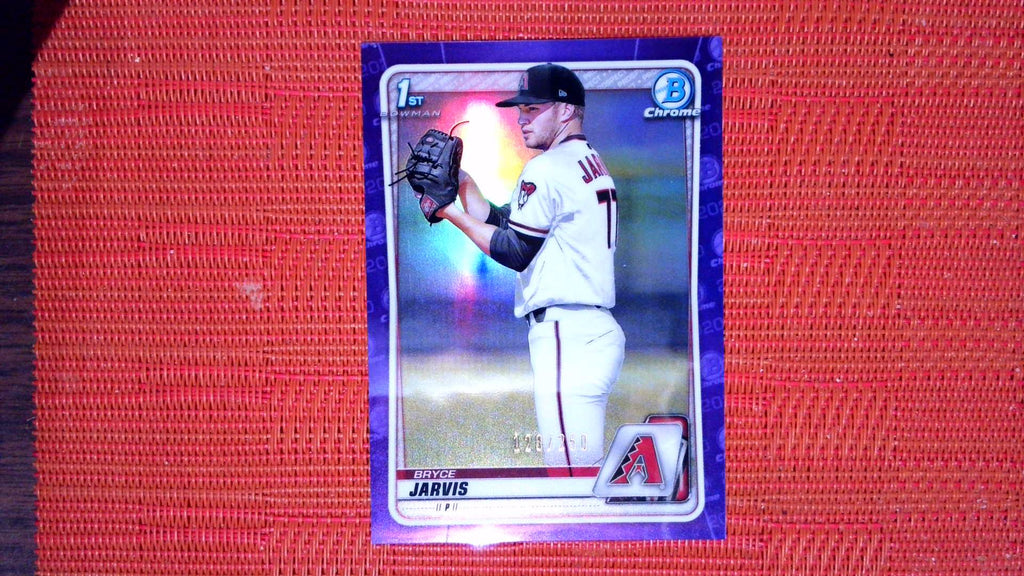 This is a nice example of a 2020 Bowman Draft #BD-127 Bryce Jarvis Chrome Purple.