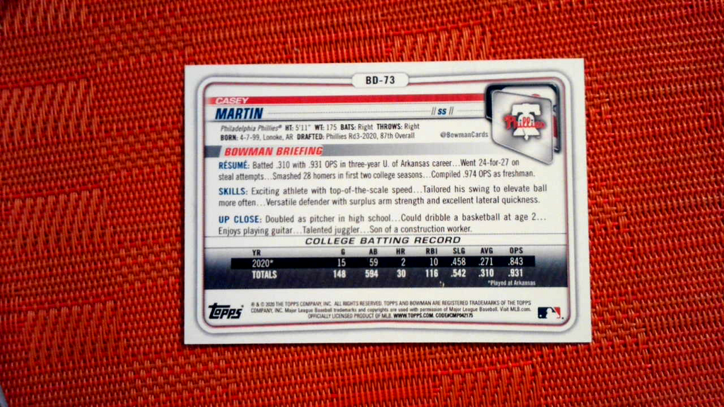 2020 Bowman Draft CASEY MARTIN Sky Blue Parallel 1st Bowman Paper /499 Phillies