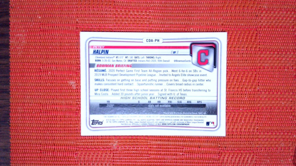 This is a nice example of a 2020 Bowman Draft #CDA-PH Petey Halpin Chrome Draft Pick Autographs Purple.