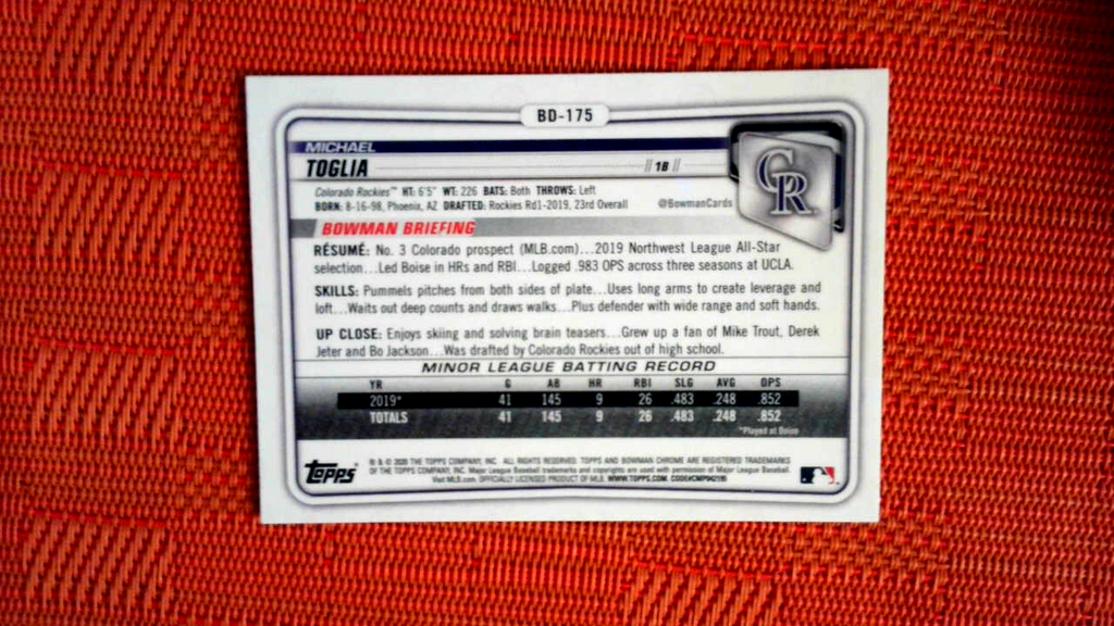 2020 Bowman Draft Chrome Purple Refractor #BD-175 MICHAEL TOGLIA /250 Rockies