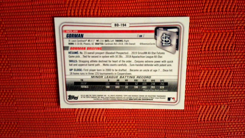 2020 Bowman Draft Chrome Sky Blue Refractor Nolan Gorman #BD-194