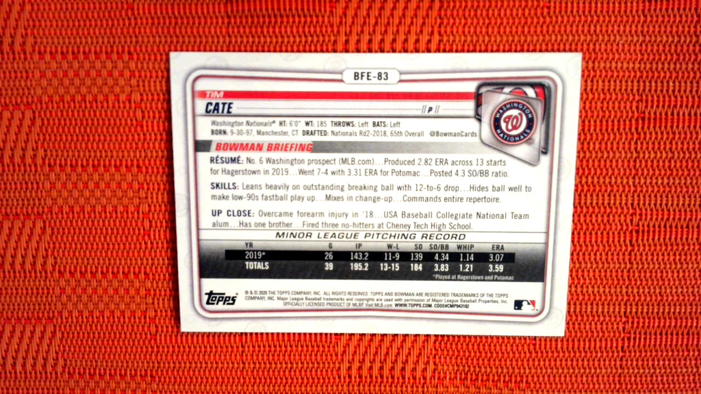 2020 Bowman First Edition Tim Cate Blue Foil #/150 Nationals BFE-83