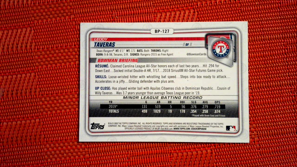 2020 Bowman LEODY TAVERAS Blue Paper #ed /150 TEXAS RANGERS