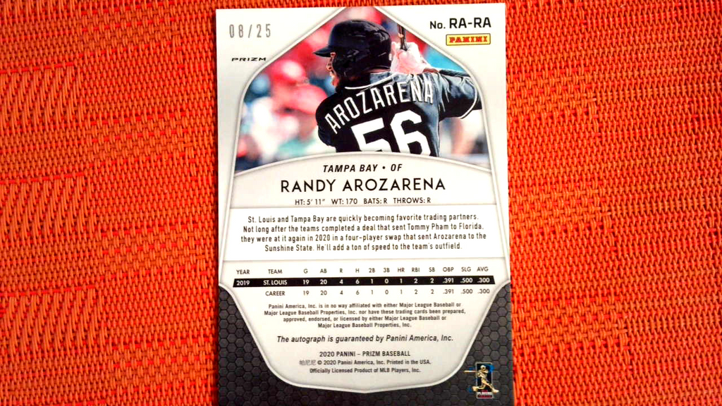 2020 Panini Prizm Red/Orange Randy Arozarena Rookie Auto #8/25 Rays