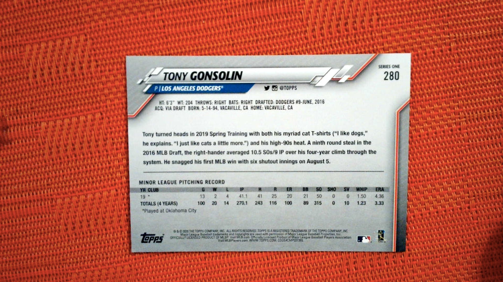 This is a nice example of a 2020 Topps #280 Tony Gonsolin Gold Star.