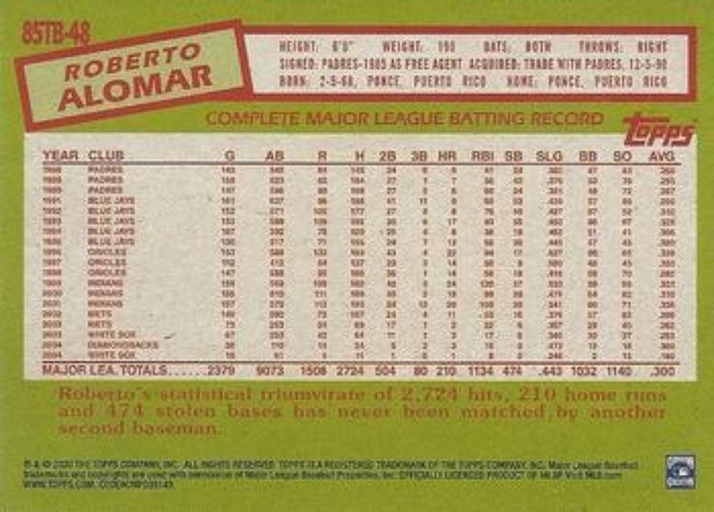 This is a nice example of a 2020 Topps #85TB-48 Roberto Alomar 1985 Topps Baseball 35th Anniversary (Series Two).