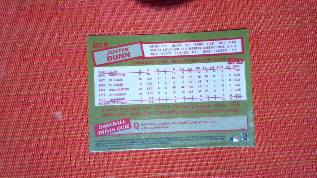 This is a nice example of a 2020 Topps #85TC-39 Justin Dunn 1985 Chrome Silver Pack Promotion (Series 2).