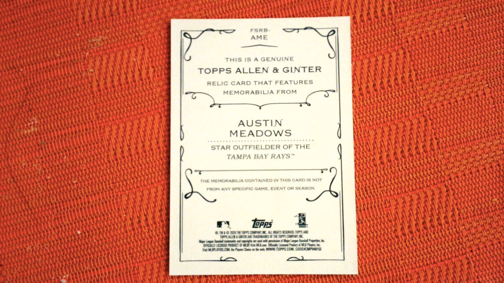 This is a nice example of a 2020 Topps Allen & Ginter #FSRB-AME Austin Meadows Full-Size Relics B.