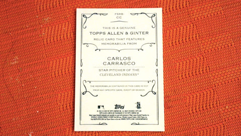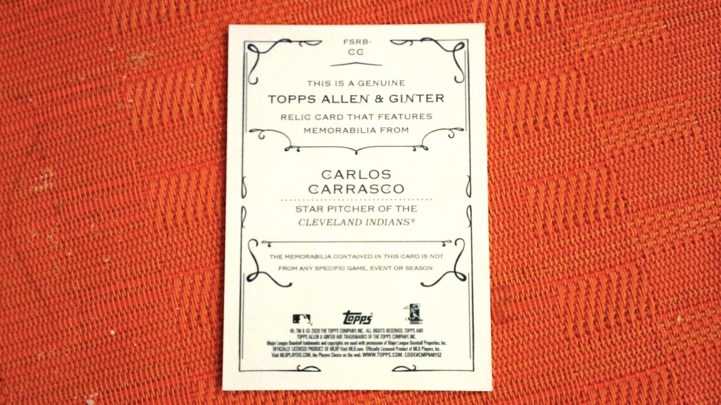 This is a nice example of a 2020 Topps Allen & Ginter #FSRB-CC Carlos Carrasco Full-Size Relics B.