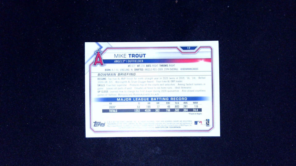 This is a nice example of a 2021 Bowman #17 Mike Trout .