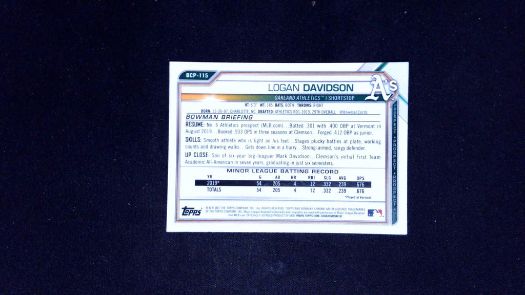 This is a nice example of a 2021 Bowman #BCP-115 Logan Davidson Chrome Prospects.
