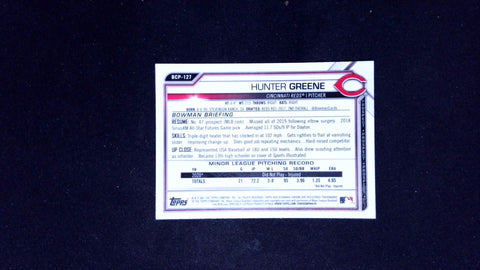 This is a nice example of a 2021 Bowman #BCP-127 Hunter Greene Chrome Prospects.