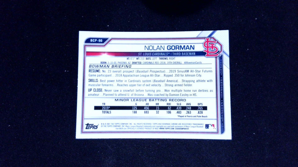 This is a nice example of a 2021 Bowman #BCP-90 Nolan Gorman Chrome Prospects.