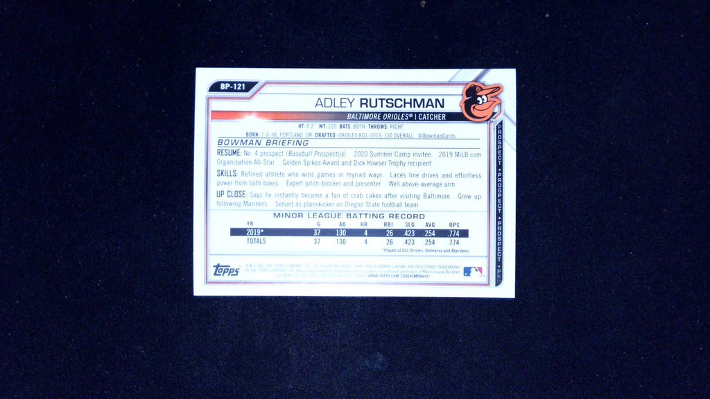 This is a nice example of a 2021 Bowman #BP-121 Adley Rutschman Prospects.