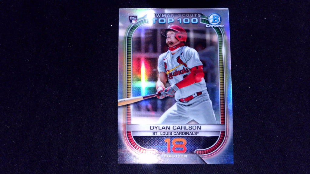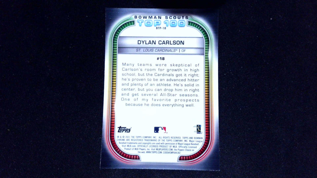 This is a nice example of a 2021 Bowman #BTP-18 Dylan Carlson Bowman Scouts Top 100.