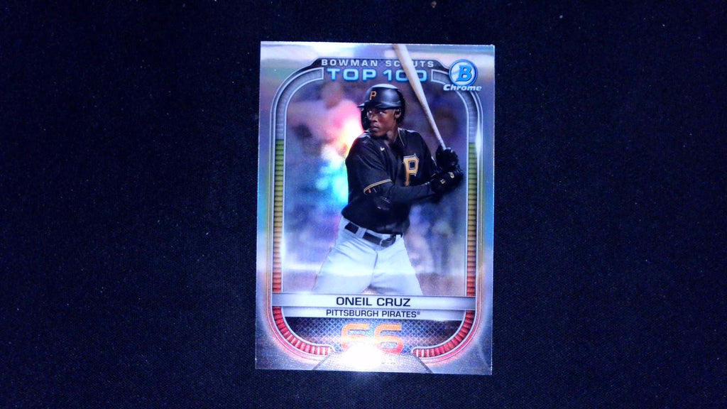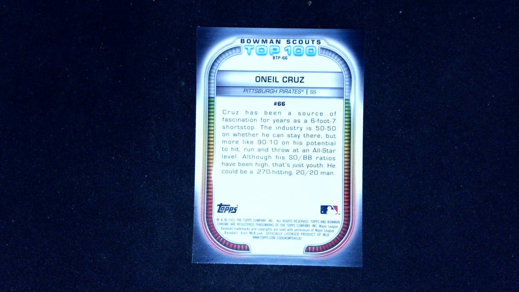 This is a nice example of a 2021 Bowman #BTP-66 Oneil Cruz Bowman Scouts Top 100.