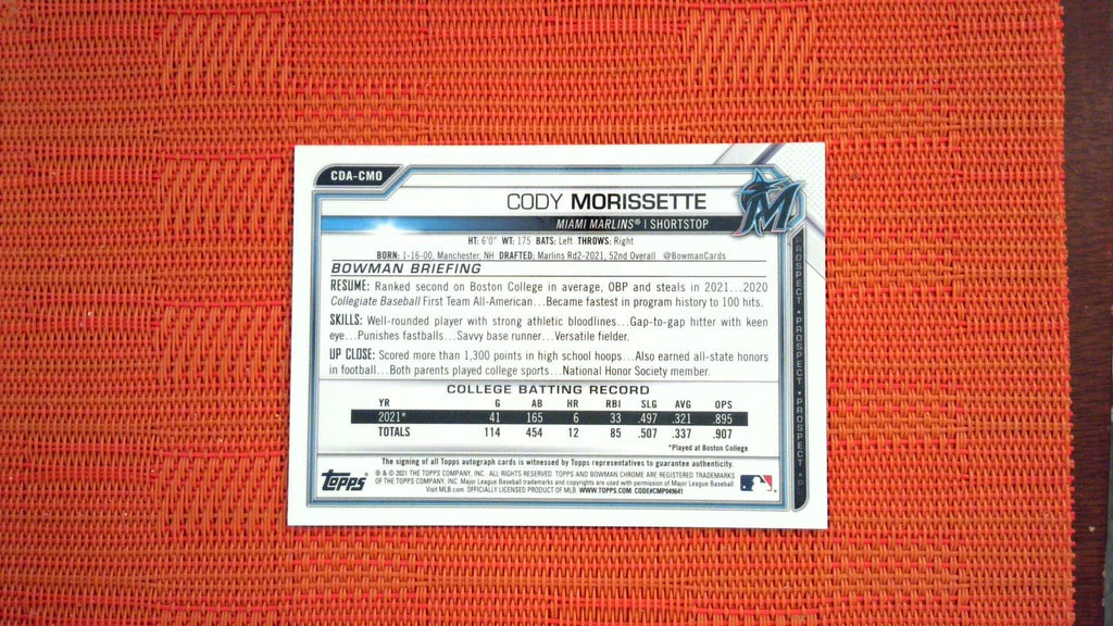 2021 Bowman Draft #CDA-CMO Cody Morissette Chrome Draft Pick Autograph Baseball