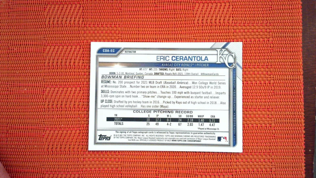 2021 Bowman Draft #CDA-EC Eric Cerantola Refractor Chrome Draft Pick Autographs Baseball