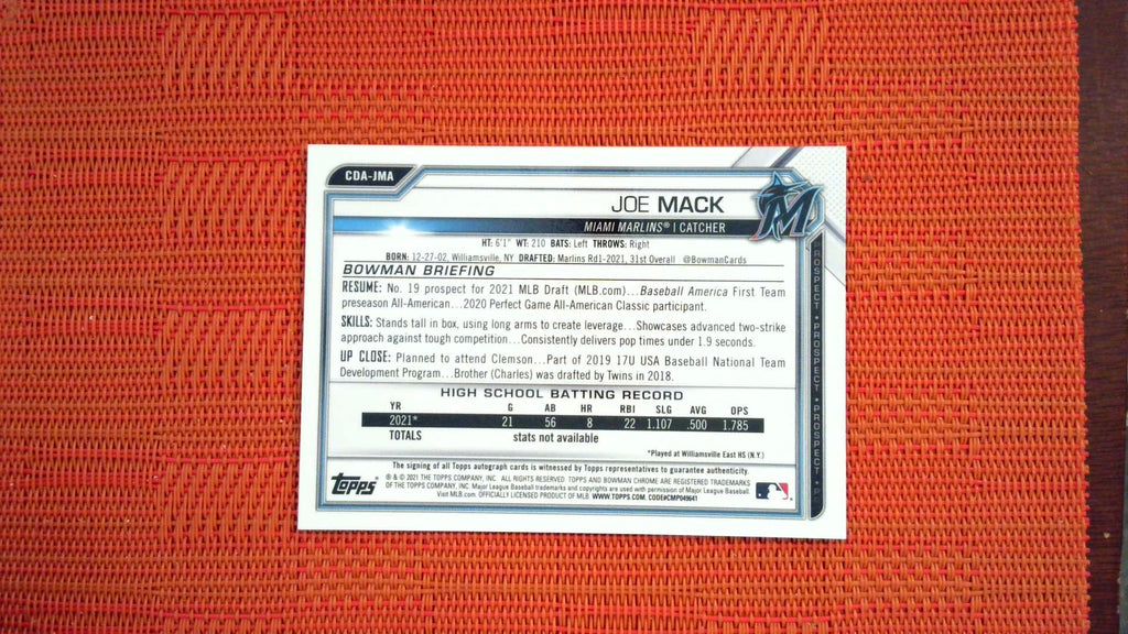 2021 Bowman Draft #CDA-JMA Joe Mack Blue Refractor /150 Chrome Draft Pick Autograph Baseball