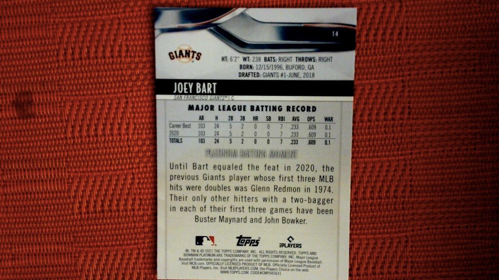 This is a nice example of a 2021 Bowman Platinum #14 Joey Bart .