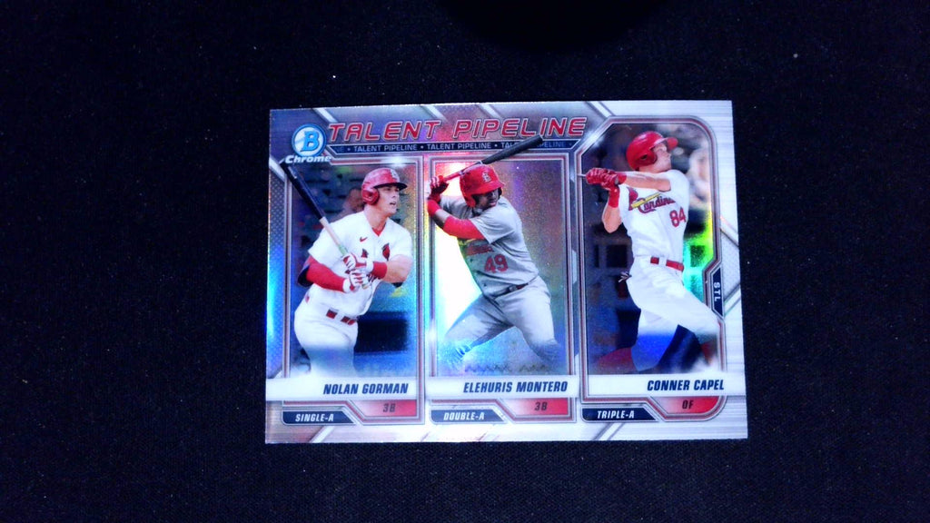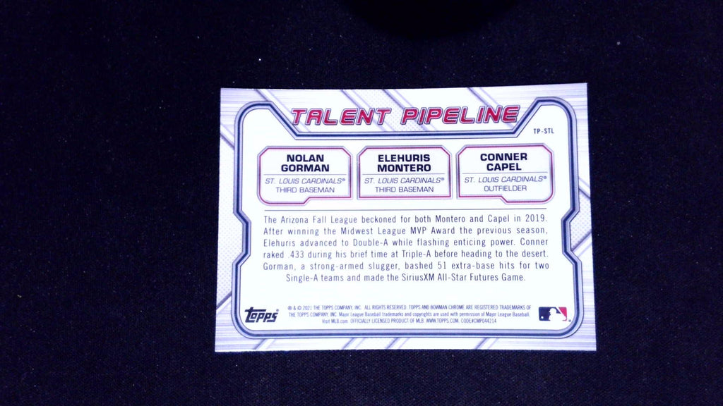 This is a nice example of a 2021 Bowman #TP-STL Nolan Gorman / Elehuris Montero / Conner Capel Talent Pipeline.