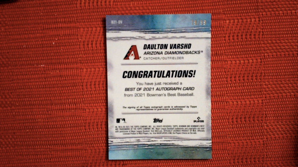 This is a nice example of a 2021 Bowman's Best #B21-DV Daulton Varsho Best of 2021 Autographs Green Refractor.