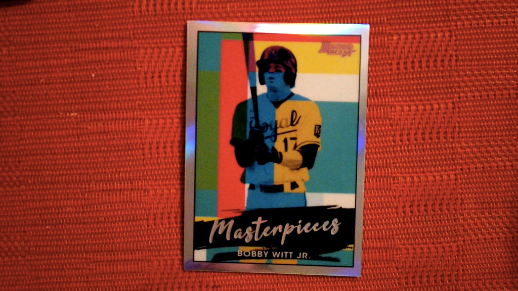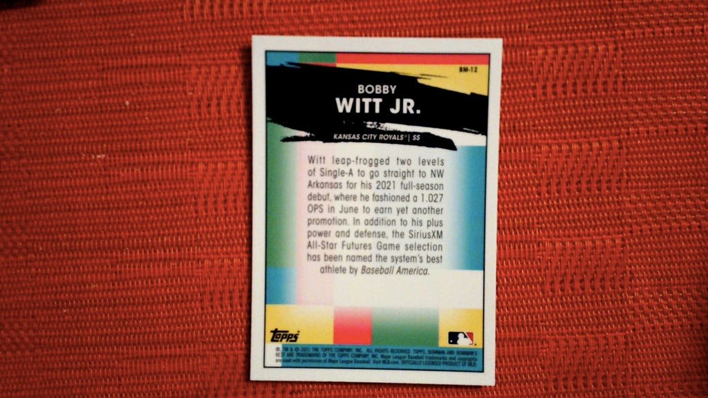 This is a nice example of a 2021 Bowman's Best #BM-12 Bobby Witt Jr. Bowman Masterpieces.