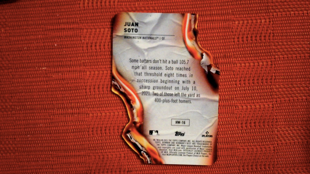 This is a nice example of a 2021 Bowman's Best #HW-16 Juan Soto .