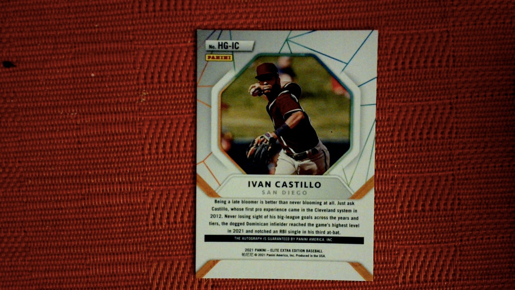 This is a nice example of a 2021 Panini Elite Extra Edition #HG-IC Ivan Castillo Hidden Gems Signatures Red/White/Blue.