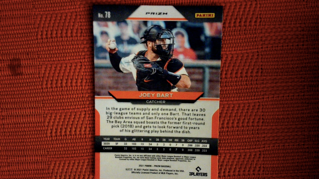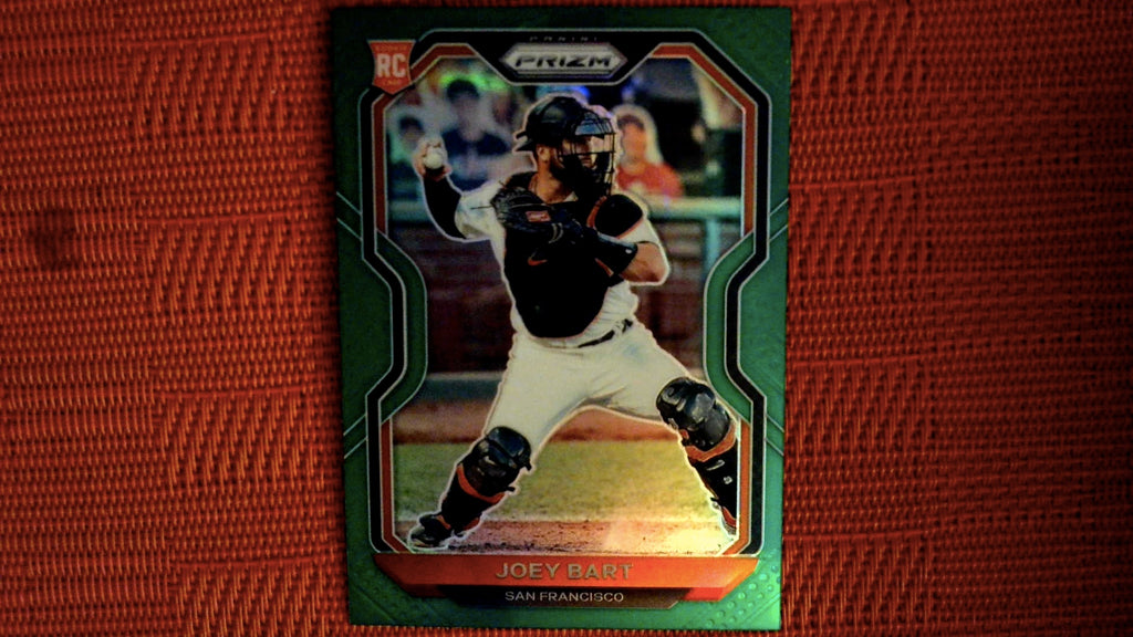 This is a nice example of a 2021 Panini Prizm #78 Joey Bart Green Prizm.