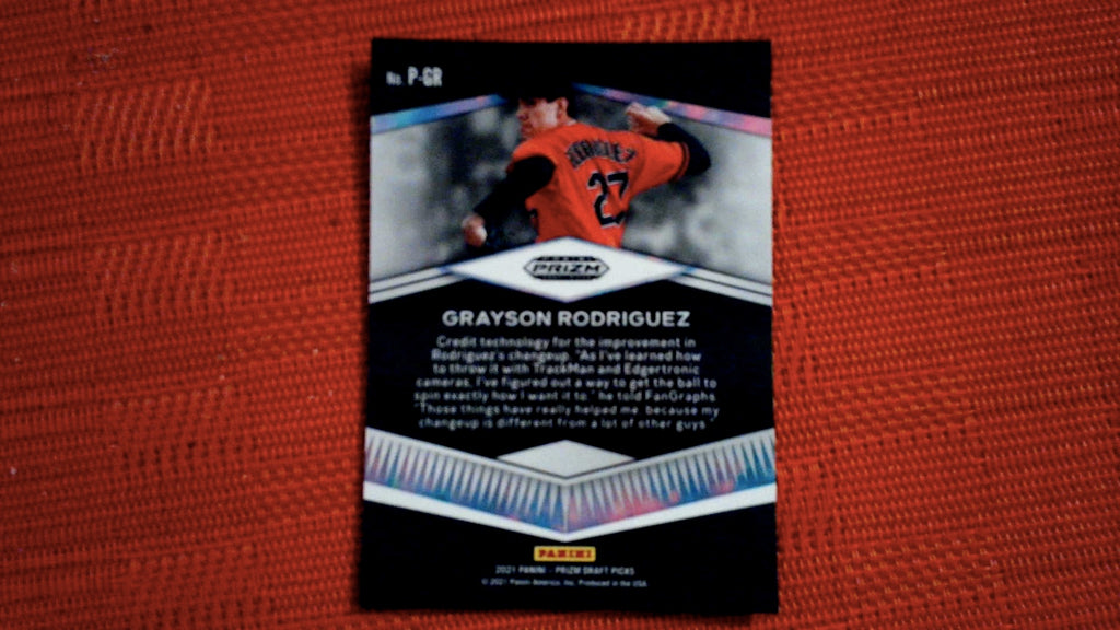 This is a nice example of a 2021 Panini Prizm Draft Picks #P-GR Grayson Rodriguez Prospects.
