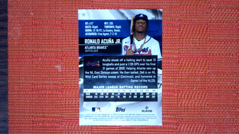 This is a nice example of a 2021 Stadium Club #57 Ronald Acuña Jr. Red Foil.