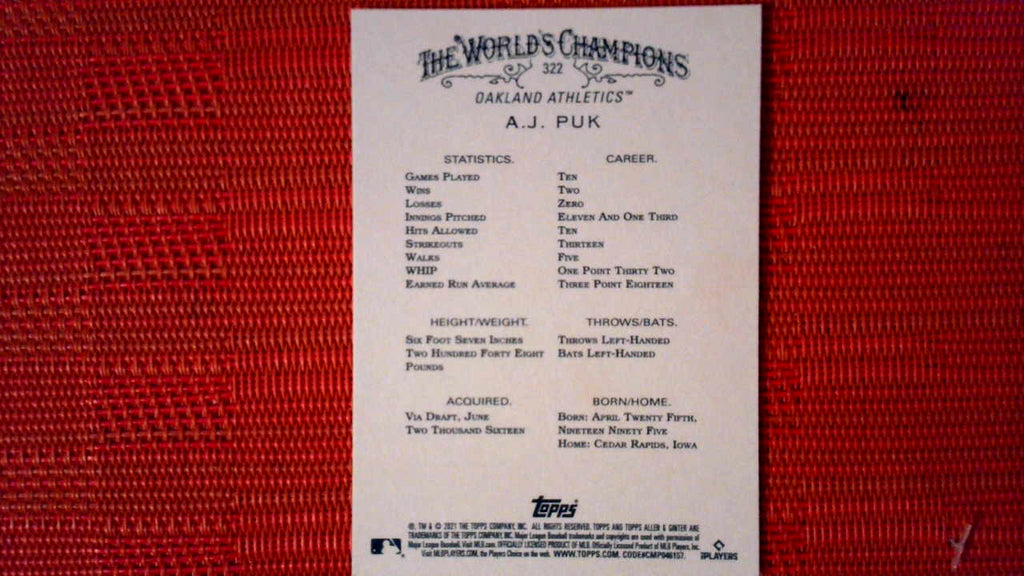 2021 Topps Allen & Ginter: #322 A.J. Puk - Oakland Athletics (SP)