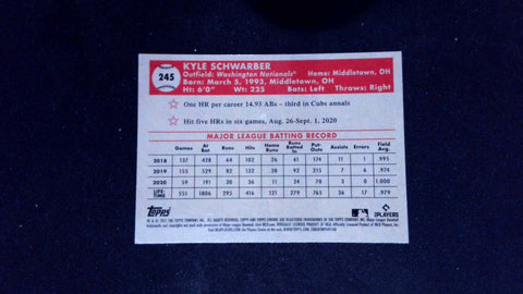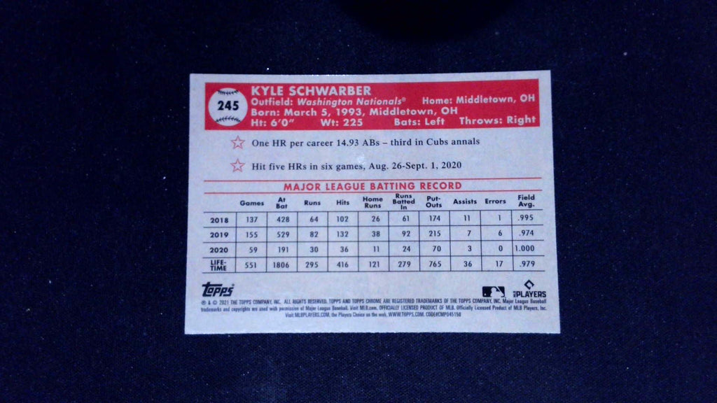 This is a nice example of a 2021 Topps Chrome Platinum Anniversary #245 Kyle Schwarber Black & White Mini-Diamonds Refractor.