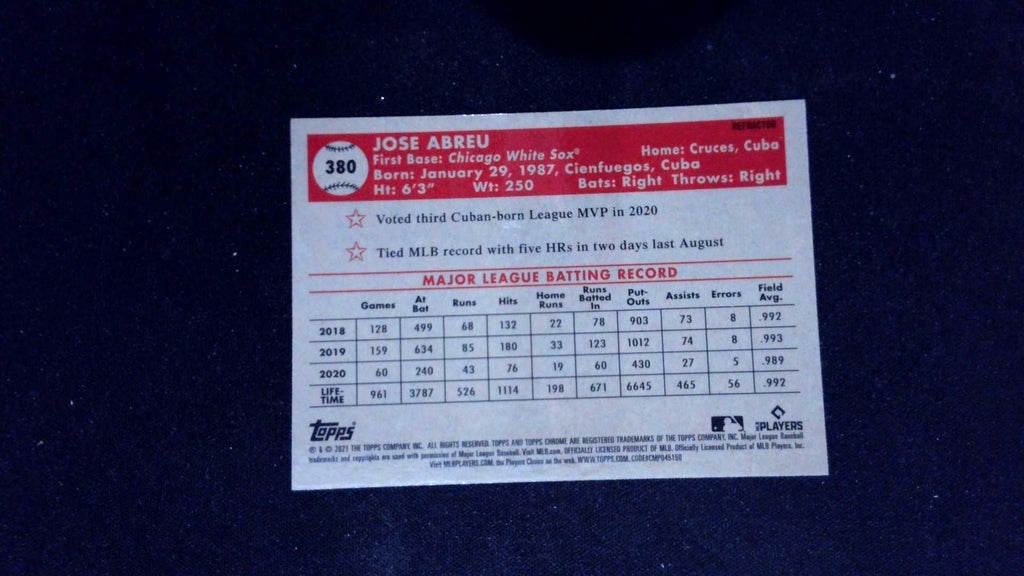 This is a nice example of a 2021 Topps Chrome Platinum Anniversary #380 Jose Abreu Prism Refractor.