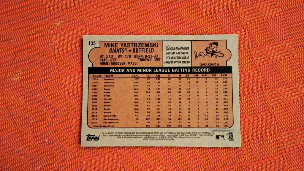This is a nice example of a 2021 Topps Heritage #135 Mike Yastrzemski Chrome Blue Sparkle.