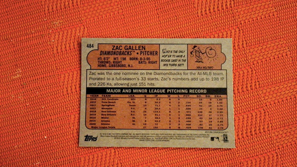 This is a nice example of a 2021 Topps Heritage #484 Zac Gallen .
