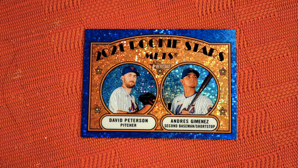 This is a nice example of a 2021 Topps Heritage #5 2021 Rookie Stars - Mets - Andres Gimenez / David Peterson Chrome Blue Sparkle.