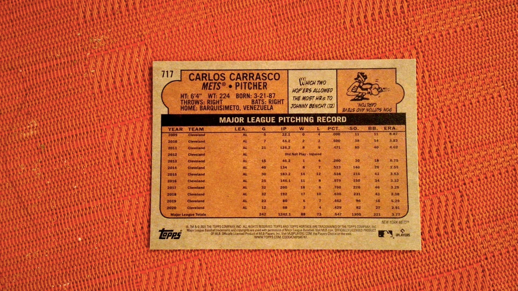 This is a nice example of a 2021 Topps Heritage #717 Carlos Carrasco .